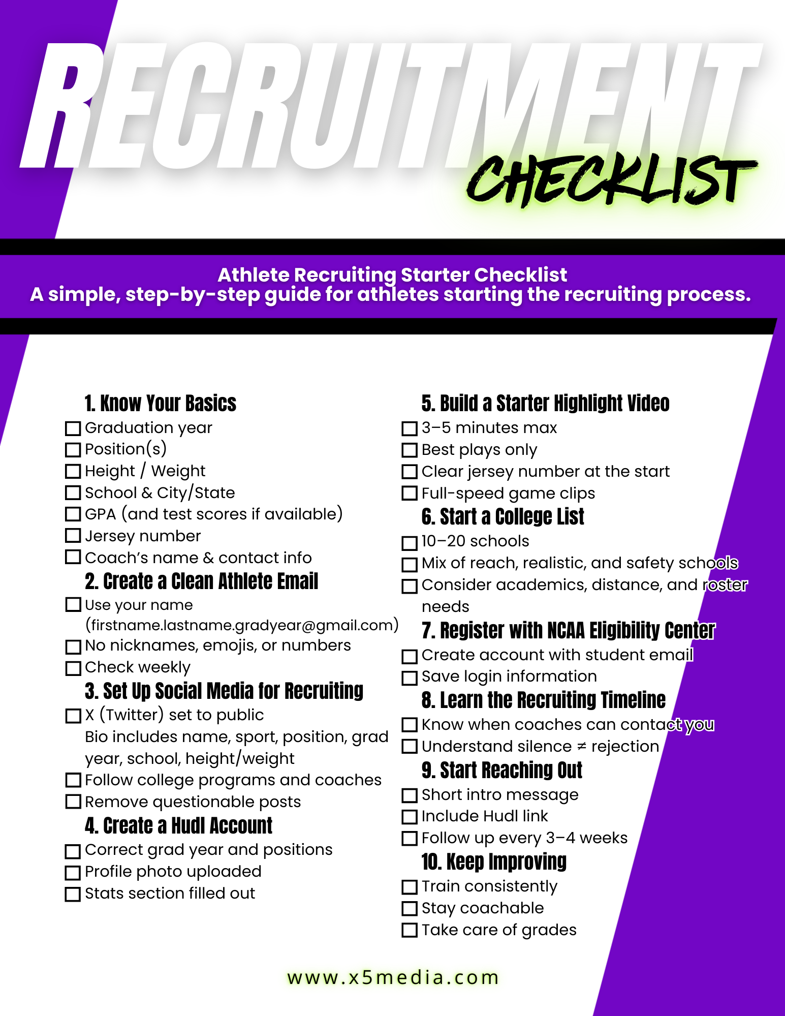 The recruiting process doesn’t have to be complicated to be effective. This beginner checklist was created for athletes and families who are new to recruiting and aren’t sure where to start. It simplifies the process into a step-by-step guide, helping you focus on what actually matters right now—so you can move forward with clarity instead of stress.